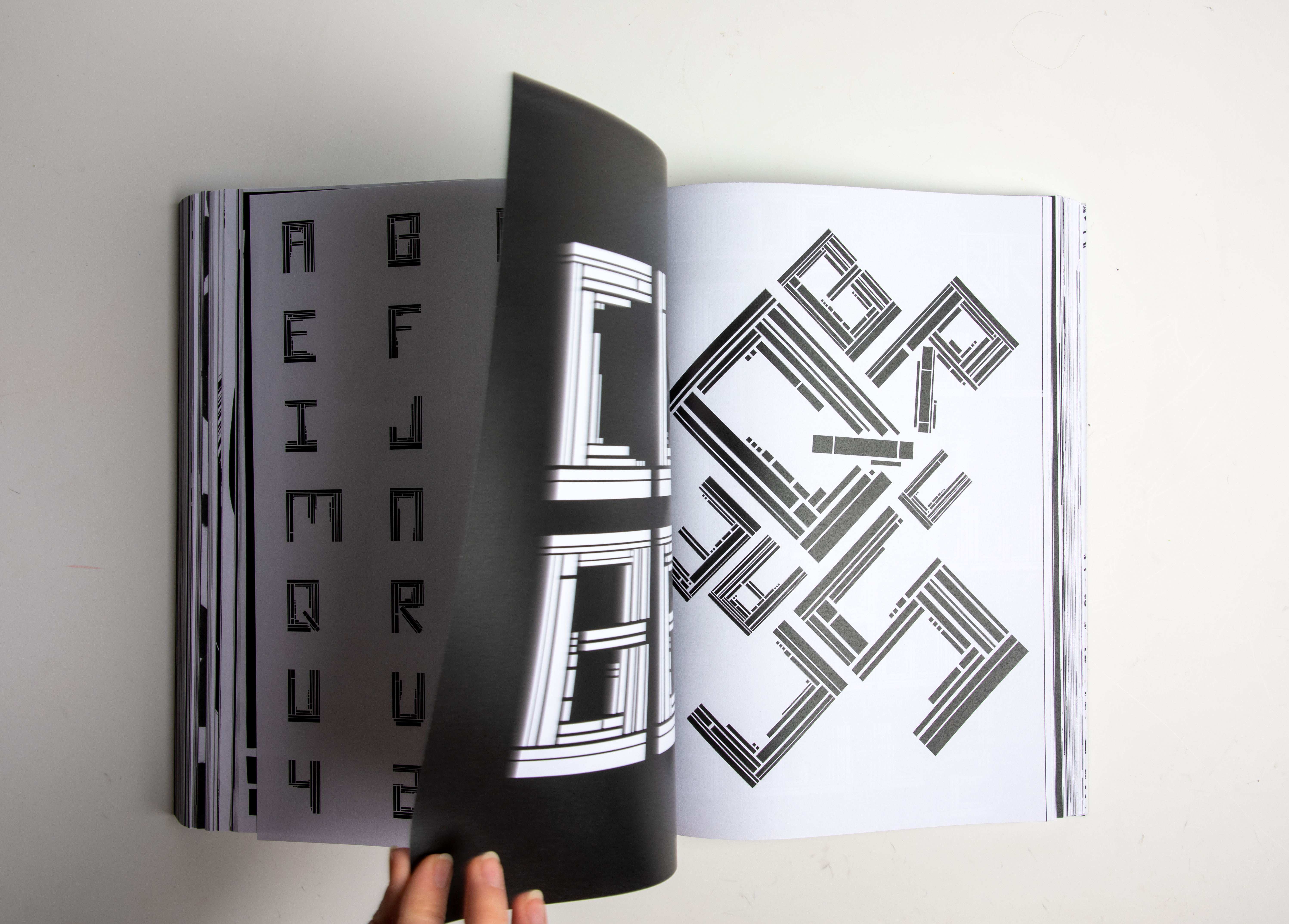Een zelf ontworpen lettertype genaamd Square. Opgebouwd uit vierkantjes en rechthoeken.